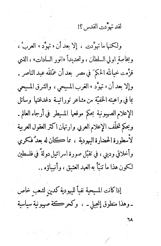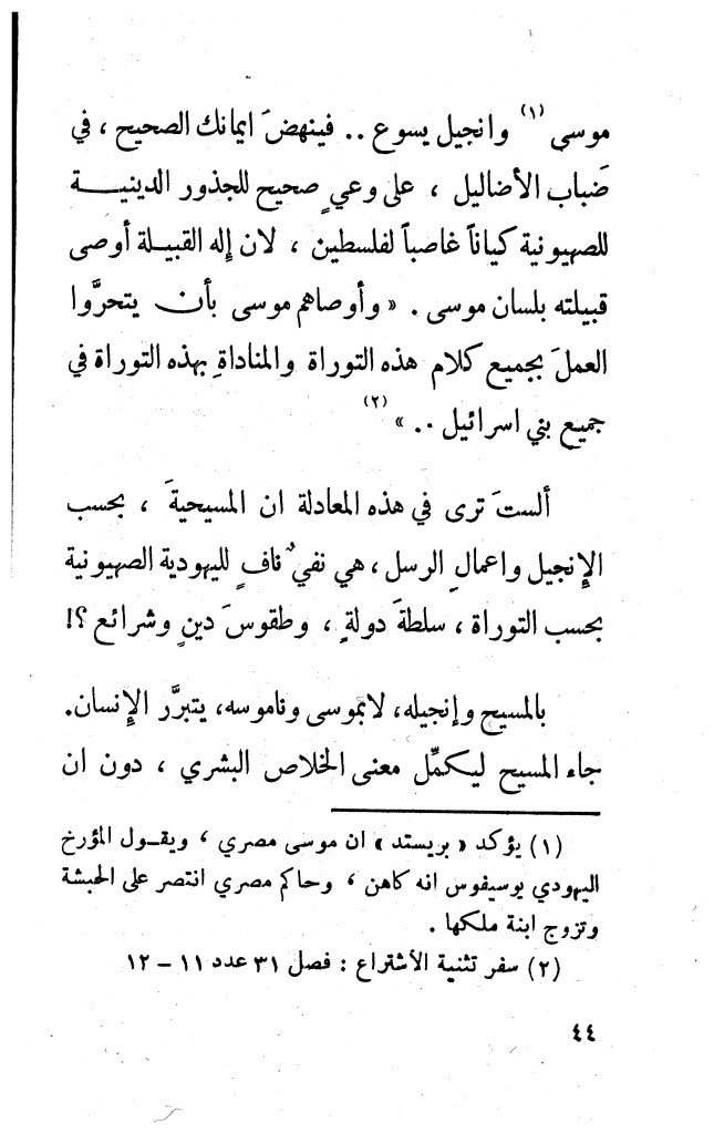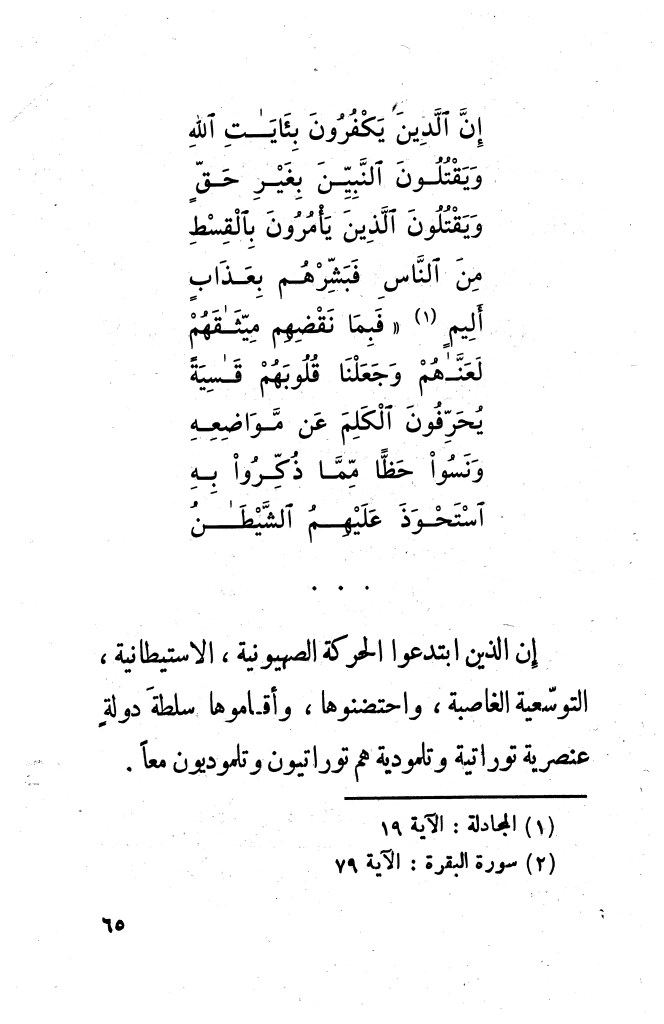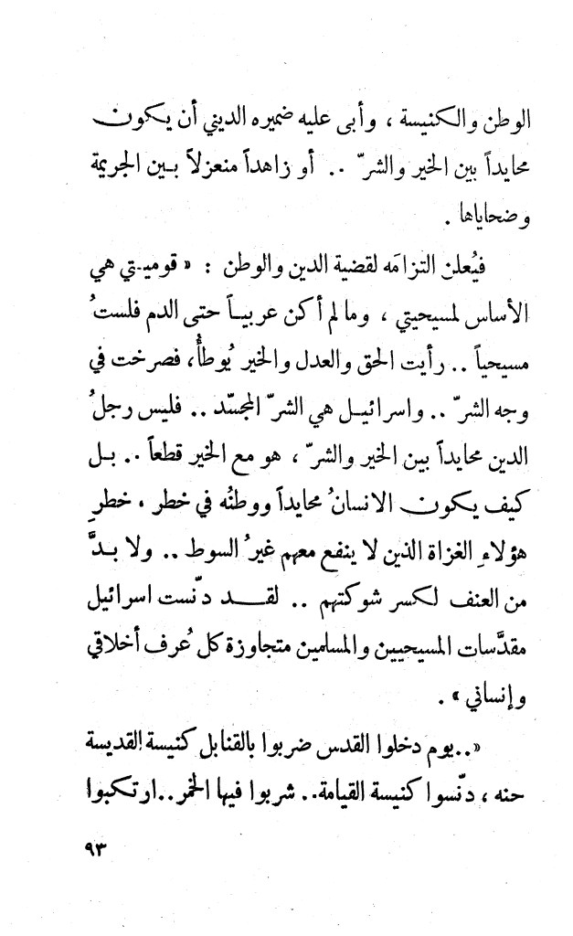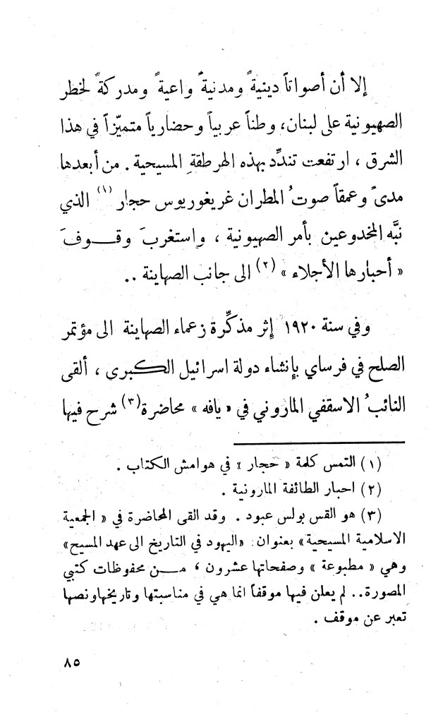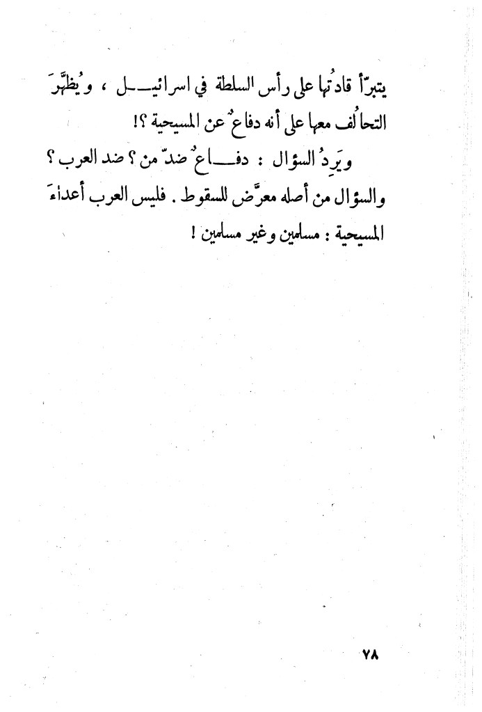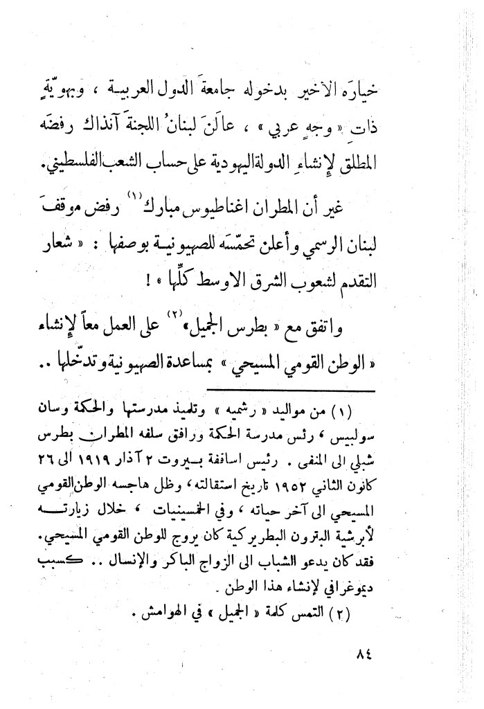 | الأب طانيوس منعم خطر اليهودية الصهيونية على النصرانية والاسلام طبعة ثانية مصححة ومنقحة اقرأ وربك الاكرم الذي علم بالقلم علم الانسان ما لم يعلم العلق : ( ٣ – ٤ – ٥) مقدمة للحقيقة : انجيلاً وللحقيقة : قرآناً وللحقيقة : تاريخاً وللحقيقة : إعلاماً وإعلاناً كانت هذه الحروف صفحات في كتاب في الذاكرة معلومات هي في الذهن معارف وهذه وتلك في عمل يُمارس ، وواقع يُعايش حقائق تعقل فالتاريخ لا يكتب مرة واحدة (…) تمهيد نحن اليوم ، في لبنان والعالم العربي ، أمام تحديات خطيرة ، وفي فم منعطف تاريخي خطير. وما نعاني ، على أرض الوطن ، من صراع دموي ، وتمزق روحي وأخلاقي مرده الى جملة أسباب، من أعمقها جذوراً، جهلنا المزمن لحقيقة اليهودية، وبالتالي الصهيونية، مضافاً إلى جهل ذوي الحكم ، أو تجاهلهم ، منذ نشوء الكيان الصهيوني على تراب فلسطين العربية . فلقد واجهنا الصراع ، ولا نملك من فهم أسبابه ما يعيننا على مواجهته ، بامتلاك أدوات المواجهة ، لأننا لا نعي هذه الأسباب وعياً موضوعياً ، وتاريخياً ، كما لا نعي هذه الأدوات . جيلنا الذي يكابد الصراع أقسى مكابدة نشأ في منأيّ ثقافي عن فهم قضية فلسطين ، من حيث هي جوهر ما يعتمل في الشرق الأوسط من صراع .. ومن حيث إن الصهيونية نواة هذا الصراع. نشأنا ننظر الى واقع القضية نظر عين لامّة ، لا نظر عينٍ ناقدة . حرِّم علينا ذكر كلمة اسرائيل في كتاب ، أو صحيفة . كأنما ورودها هرطقة وطنية! وبخاصة في أعقاب حرب سنة ١٩٤٨ . هذه الحرب التي كانت ائتماراً بالعرب ، وباشتراك العرب .. أي باشتراك من يُسمّون قادةً : ملوكاً ورؤساء. لقد غرسوا رؤوسنا في رمال غير متحركة وغسلوا أدمغتنا من التفكير . ومنعوا الأقلام أن تجري بحرف باحث مستنير ومنير . أو بحرف يشير الى اسرائيل ، و خطر الكيان الصهيوني العنصري الحاقد على العرب ، مسيحيين ومسلمين. حتى لكأن تجاهل وجود الشر نفي لوجوده أو نشوئه ، أو تفاقمه ، أو سيطرته. كان جيلنا ، معلمون و مربون، ورجال دين وقادة وأحزاب في أُميّة ثقافية وسياسية ودينية لا يحسد عليها ، ولكن يرثى لها . فما كانت قضية فلسطين وقضية الصهيونية في اسرائيل ، تعني لديه شيئاً لا في تاريخها القديم، ولا في تاريخها الحديث . ولا في ما لها من مخاطر تتفاعل على مسرح الشرق الأوسط. ونحن فيها نحن ، معنيون لحّاً بهذا التفاعل ، في أسبابه ونتائجه . وتوثيقاً لما أقول أسوق هذا الدليل : خذ اليك برامج التعليم الرسمي في الأربعينيات حتى الستينيات، وما يترتب عليها من كتب ، فإنك لا تجد درساً واحداً في كتاب مدرسي يتناول قضية فلسطين ، والفلسطينيون مطرودون من أرضهم ، لاجئون في أرضنا . ومن أمس قريب كنت إذا ذاكرت أي أستاذ ثانوي ، أو طارحت جامعياً ، خطر الصهيونية على لبنان ، وعلاقتها بالقضية الفلسطينية ، وقعت على ما هو عجب عجاب ، فكراً وموقفاً ، هذا إذا لم يكتف بهز الكتفين وقلب الشفتين ، كأنما الأمر لا يعنيه ، ولا يثير اهتمامه من قرب أو بعد وهذه اللامبالاة انما هي نتاج فراغ ثقافي ، سياسي في هذا الباب ، غير مقصور على المثقفين وأكثرية الشعب، بل يتناول القادة والزعماء . فلقد كانت المنافع الآنية لهؤلاء حجاباً كثيفاً ما نعاً من استكشاف الغد، واستشفاف المستقبل. ولعل البحث البكر الذي تناول قضية فلسطين ، ولو على نحو مختل وأيديولوجية مريضة، كتاب « التنشئة الوطنية الانسانية » (1) ، ولكنه ظل كتاباً مطبوعاً بأناقة ، فلم يُعتمد ، ولم يُدرّس . واستبدل به كتاب آخر في « التربية المدنية » كان له حظ سلفه ، وألغيت مادة التربية من البرنامج الرسمي ، وظَلَّ النشء اللبناني ، في المراحل الثانوية ، بلا تربية مدنية وإنسانية ، ترك انتفاؤها من « ثقافة » الانسان في لبنان ممارسات لا إنسانية ورواسم وحشية ، في الحرب اللبنانية القذرة ، على مساحة هذا الوطن . وظل الوطن والمواطن بلا هوية ، لأن ذوي الأمر فينا ، وذوي السلطان ، مختلفون في شأن الهوية . . وجوهر خلافهم طائفي ، سياسي إيديولوجي . فما كان التوجيه التربوي هادفاً الى بناء وطن ومواطنين ينصهرون في و