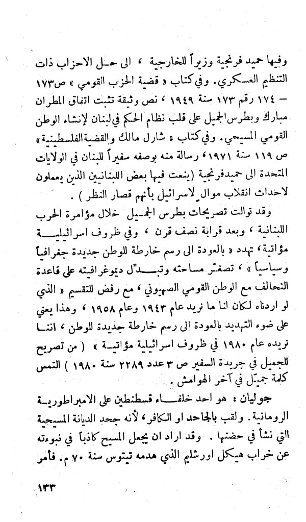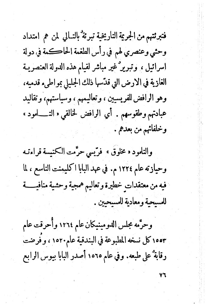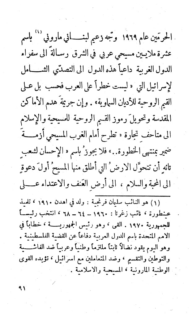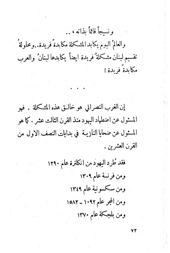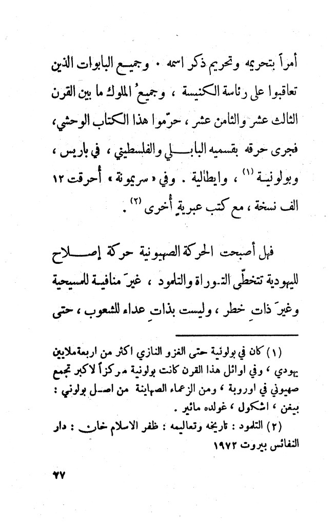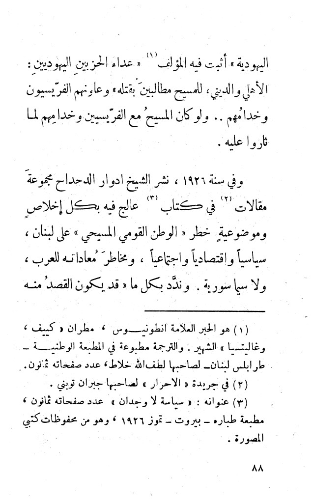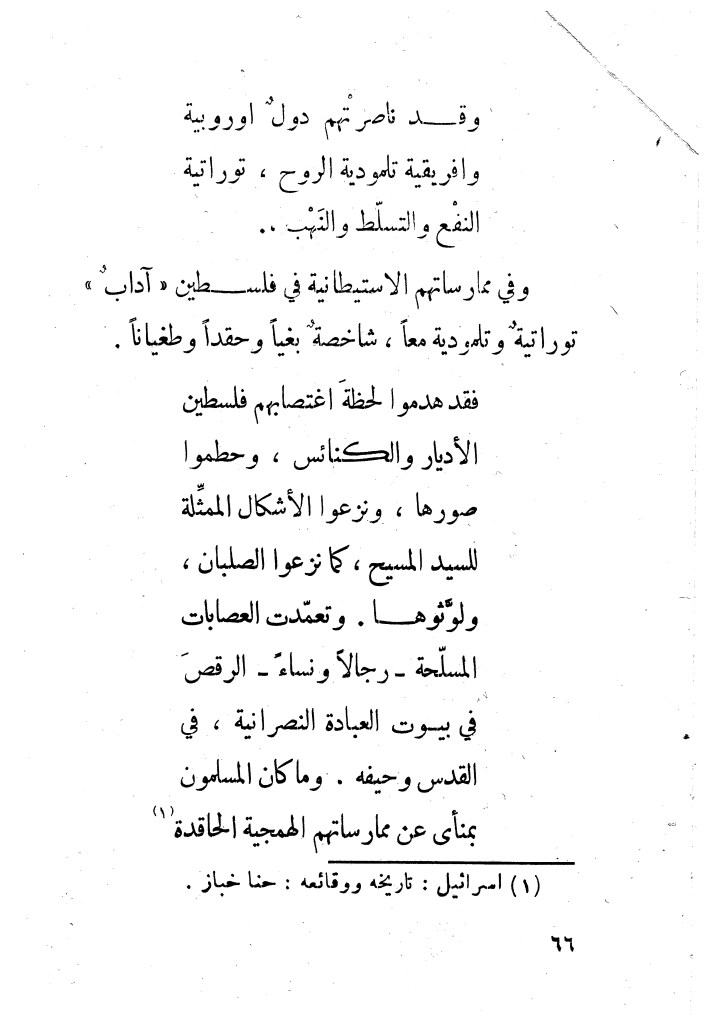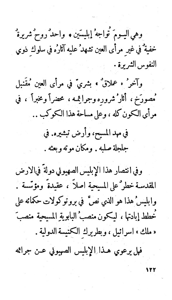 | الأب طانيوس منعم خطر اليهودية الصهيونية على النصرانية والاسلام طبعة ثانية مصححة ومنقحة اقرأ وربك الاكرم الذي علم بالقلم علم الانسان ما لم يعلم العلق : ( ٣ – ٤ – ٥) مقدمة للحقيقة : انجيلاً وللحقيقة : قرآناً وللحقيقة : تاريخاً وللحقيقة : إعلاماً وإعلاناً كانت هذه الحروف صفحات في كتاب في الذاكرة معلومات هي في الذهن معارف وهذه وتلك في عمل يُمارس ، وواقع يُعايش حقائق تعقل فالتاريخ لا يكتب مرة واحدة (…) تمهيد نحن اليوم ، في لبنان والعالم العربي ، أمام تحديات خطيرة ، وفي فم منعطف تاريخي خطير. وما نعاني ، على أرض الوطن ، من صراع دموي ، وتمزق روحي وأخلاقي مرده الى جملة أسباب، من أعمقها جذوراً، جهلنا المزمن لحقيقة اليهودية، وبالتالي الصهيونية، مضافاً إلى جهل ذوي الحكم ، أو تجاهلهم ، منذ نشوء الكيان الصهيوني على تراب فلسطين العربية . فلقد واجهنا الصراع ، ولا نملك من فهم أسبابه ما يعيننا على مواجهته ، بامتلاك أدوات المواجهة ، لأننا لا نعي هذه الأسباب وعياً موضوعياً ، وتاريخياً ، كما لا نعي هذه الأدوات . جيلنا الذي يكابد الصراع أقسى مكابدة نشأ في منأيّ ثقافي عن فهم قضية فلسطين ، من حيث هي جوهر ما يعتمل في الشرق الأوسط من صراع .. ومن حيث إن الصهيونية نواة هذا الصراع. نشأنا ننظر الى واقع القضية نظر عين لامّة ، لا نظر عينٍ ناقدة . حرِّم علينا ذكر كلمة اسرائيل في كتاب ، أو صحيفة . كأنما ورودها هرطقة وطنية! وبخاصة في أعقاب حرب سنة ١٩٤٨ . هذه الحرب التي كانت ائتماراً بالعرب ، وباشتراك العرب .. أي باشتراك من يُسمّون قادةً : ملوكاً ورؤساء. لقد غرسوا رؤوسنا في رمال غير متحركة وغسلوا أدمغتنا من التفكير . ومنعوا الأقلام أن تجري بحرف باحث مستنير ومنير . أو بحرف يشير الى اسرائيل ، و خطر الكيان الصهيوني العنصري الحاقد على العرب ، مسيحيين ومسلمين. حتى لكأن تجاهل وجود الشر نفي لوجوده أو نشوئه ، أو تفاقمه ، أو سيطرته. كان جيلنا ، معلمون و مربون، ورجال دين وقادة وأحزاب في أُميّة ثقافية وسياسية ودينية لا يحسد عليها ، ولكن يرثى لها . فما كانت قضية فلسطين وقضية الصهيونية في اسرائيل ، تعني لديه شيئاً لا في تاريخها القديم، ولا في تاريخها الحديث . ولا في ما لها من مخاطر تتفاعل على مسرح الشرق الأوسط. ونحن فيها نحن ، معنيون لحّاً بهذا التفاعل ، في أسبابه ونتائجه . وتوثيقاً لما أقول أسوق هذا الدليل : خذ اليك برامج التعليم الرسمي في الأربعينيات حتى الستينيات، وما يترتب عليها من كتب ، فإنك لا تجد درساً واحداً في كتاب مدرسي يتناول قضية فلسطين ، والفلسطينيون مطرودون من أرضهم ، لاجئون في أرضنا . ومن أمس قريب كنت إذا ذاكرت أي أستاذ ثانوي ، أو طارحت جامعياً ، خطر الصهيونية على لبنان ، وعلاقتها بالقضية الفلسطينية ، وقعت على ما هو عجب عجاب ، فكراً وموقفاً ، هذا إذا لم يكتف بهز الكتفين وقلب الشفتين ، كأنما الأمر لا يعنيه ، ولا يثير اهتمامه من قرب أو بعد وهذه اللامبالاة انما هي نتاج فراغ ثقافي ، سياسي في هذا الباب ، غير مقصور على المثقفين وأكثرية الشعب، بل يتناول القادة والزعماء . فلقد كانت المنافع الآنية لهؤلاء حجاباً كثيفاً ما نعاً من استكشاف الغد، واستشفاف المستقبل. ولعل البحث البكر الذي تناول قضية فلسطين ، ولو على نحو مختل وأيديولوجية مريضة، كتاب « التنشئة الوطنية الانسانية » (1) ، ولكنه ظل كتاباً مطبوعاً بأناقة ، فلم يُعتمد ، ولم يُدرّس . واستبدل به كتاب آخر في « التربية المدنية » كان له حظ سلفه ، وألغيت مادة التربية من البرنامج الرسمي ، وظَلَّ النشء اللبناني ، في المراحل الثانوية ، بلا تربية مدنية وإنسانية ، ترك انتفاؤها من « ثقافة » الانسان في لبنان ممارسات لا إنسانية ورواسم وحشية ، في الحرب اللبنانية القذرة ، على مساحة هذا الوطن . وظل الوطن والمواطن بلا هوية ، لأن ذوي الأمر فينا ، وذوي السلطان ، مختلفون في شأن الهوية . . وجوهر خلافهم طائفي ، سياسي إيديولوجي . فما كان التوجيه التربوي هادفاً الى بناء وطن ومواطنين ينصهرون في و