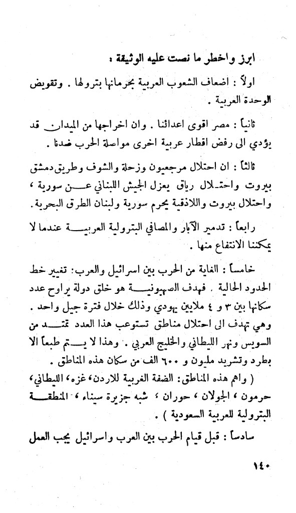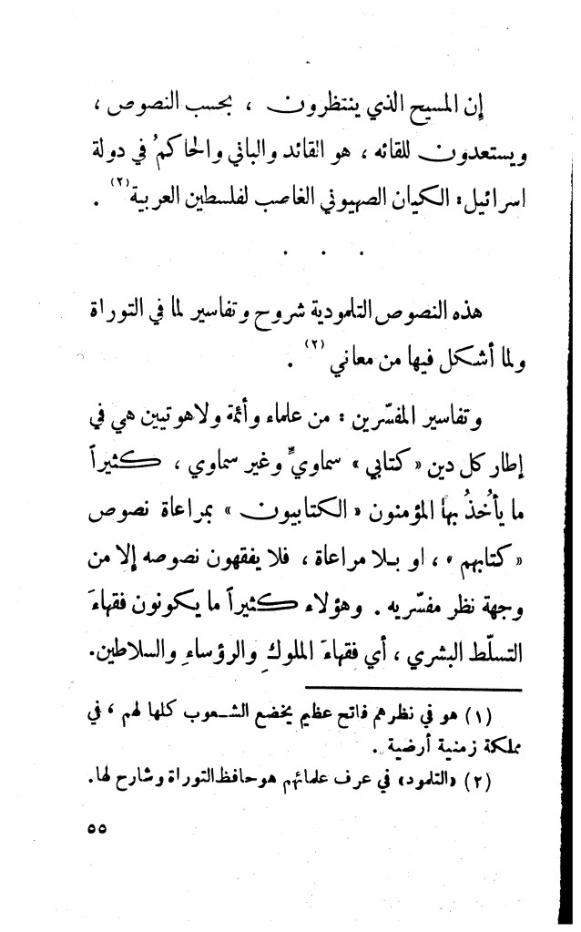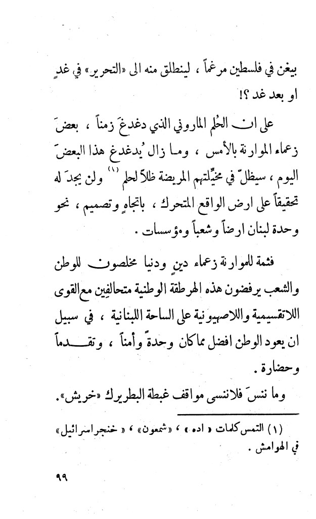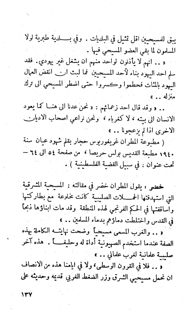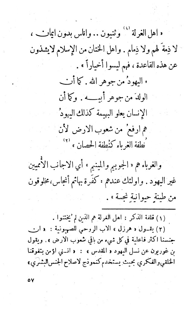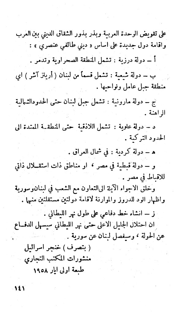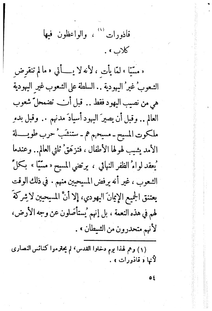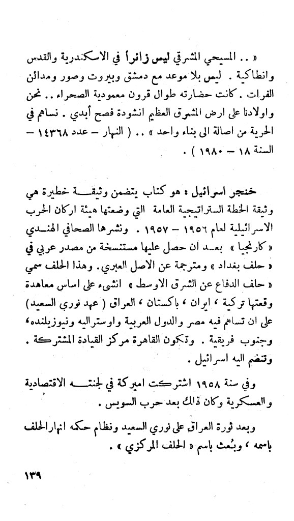| الأب طانيوس منعم خطر اليهودية الصهيونية على النصرانية والاسلام طبعة ثانية مصححة ومنقحة اقرأ وربك الاكرم الذي علم بالقلم علم الانسان ما لم يعلم العلق : ( ٣ – ٤ – ٥) مقدمة للحقيقة : انجيلاً وللحقيقة : قرآناً وللحقيقة : تاريخاً وللحقيقة : إعلاماً وإعلاناً كانت هذه الحروف صفحات في كتاب في الذاكرة معلومات هي في الذهن معارف وهذه وتلك في عمل يُمارس ، وواقع يُعايش حقائق تعقل فالتاريخ لا يكتب مرة واحدة (…) تمهيد نحن اليوم ، في لبنان والعالم العربي ، أمام تحديات خطيرة ، وفي فم منعطف تاريخي خطير. وما نعاني ، على أرض الوطن ، من صراع دموي ، وتمزق روحي وأخلاقي مرده الى جملة أسباب، من أعمقها جذوراً، جهلنا المزمن لحقيقة اليهودية، وبالتالي الصهيونية، مضافاً إلى جهل ذوي الحكم ، أو تجاهلهم ، منذ نشوء الكيان الصهيوني على تراب فلسطين العربية . فلقد واجهنا الصراع ، ولا نملك من فهم أسبابه ما يعيننا على مواجهته ، بامتلاك أدوات المواجهة ، لأننا لا نعي هذه الأسباب وعياً موضوعياً ، وتاريخياً ، كما لا نعي هذه الأدوات . جيلنا الذي يكابد الصراع أقسى مكابدة نشأ في منأيّ ثقافي عن فهم قضية فلسطين ، من حيث هي جوهر ما يعتمل في الشرق الأوسط من صراع .. ومن حيث إن الصهيونية نواة هذا الصراع. نشأنا ننظر الى واقع القضية نظر عين لامّة ، لا نظر عينٍ ناقدة . حرِّم علينا ذكر كلمة اسرائيل في كتاب ، أو صحيفة . كأنما ورودها هرطقة وطنية! وبخاصة في أعقاب حرب سنة ١٩٤٨ . هذه الحرب التي كانت ائتماراً بالعرب ، وباشتراك العرب .. أي باشتراك من يُسمّون قادةً : ملوكاً ورؤساء. لقد غرسوا رؤوسنا في رمال غير متحركة وغسلوا أدمغتنا من التفكير . ومنعوا الأقلام أن تجري بحرف باحث مستنير ومنير . أو بحرف يشير الى اسرائيل ، و خطر الكيان الصهيوني العنصري الحاقد على العرب ، مسيحيين ومسلمين. حتى لكأن تجاهل وجود الشر نفي لوجوده أو نشوئه ، أو تفاقمه ، أو سيطرته. كان جيلنا ، معلمون و مربون، ورجال دين وقادة وأحزاب في أُميّة ثقافية وسياسية ودينية لا يحسد عليها ، ولكن يرثى لها . فما كانت قضية فلسطين وقضية الصهيونية في اسرائيل ، تعني لديه شيئاً لا في تاريخها القديم، ولا في تاريخها الحديث . ولا في ما لها من مخاطر تتفاعل على مسرح الشرق الأوسط. ونحن فيها نحن ، معنيون لحّاً بهذا التفاعل ، في أسبابه ونتائجه . وتوثيقاً لما أقول أسوق هذا الدليل : خذ اليك برامج التعليم الرسمي في الأربعينيات حتى الستينيات، وما يترتب عليها من كتب ، فإنك لا تجد درساً واحداً في كتاب مدرسي يتناول قضية فلسطين ، والفلسطينيون مطرودون من أرضهم ، لاجئون في أرضنا . ومن أمس قريب كنت إذا ذاكرت أي أستاذ ثانوي ، أو طارحت جامعياً ، خطر الصهيونية على لبنان ، وعلاقتها بالقضية الفلسطينية ، وقعت على ما هو عجب عجاب ، فكراً وموقفاً ، هذا إذا لم يكتف بهز الكتفين وقلب الشفتين ، كأنما الأمر لا يعنيه ، ولا يثير اهتمامه من قرب أو بعد وهذه اللامبالاة انما هي نتاج فراغ ثقافي ، سياسي في هذا الباب ، غير مقصور على المثقفين وأكثرية الشعب، بل يتناول القادة والزعماء . فلقد كانت المنافع الآنية لهؤلاء حجاباً كثيفاً ما نعاً من استكشاف الغد، واستشفاف المستقبل. ولعل البحث البكر الذي تناول قضية فلسطين ، ولو على نحو مختل وأيديولوجية مريضة، كتاب « التنشئة الوطنية الانسانية » (1) ، ولكنه ظل كتاباً مطبوعاً بأناقة ، فلم يُعتمد ، ولم يُدرّس . واستبدل به كتاب آخر في « التربية المدنية » كان له حظ سلفه ، وألغيت مادة التربية من البرنامج الرسمي ، وظَلَّ النشء اللبناني ، في المراحل الثانوية ، بلا تربية مدنية وإنسانية ، ترك انتفاؤها من « ثقافة » الانسان في لبنان ممارسات لا إنسانية ورواسم وحشية ، في الحرب اللبنانية القذرة ، على مساحة هذا الوطن . وظل الوطن والمواطن بلا هوية ، لأن ذوي الأمر فينا ، وذوي السلطان ، مختلفون في شأن الهوية . . وجوهر خلافهم طائفي ، سياسي إيديولوجي . فما كان التوجيه التربوي هادفاً الى بناء وطن ومواطنين ينصهرون في و