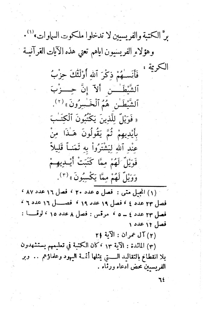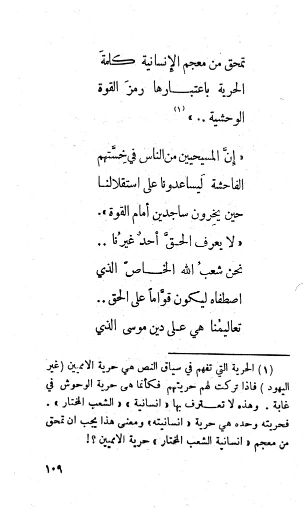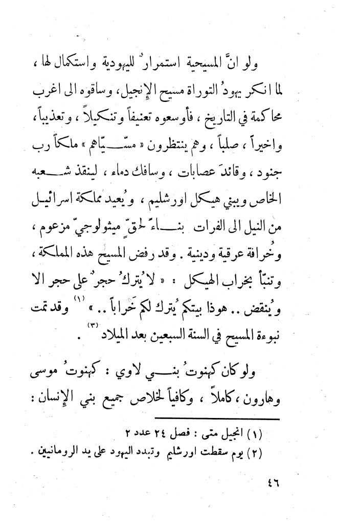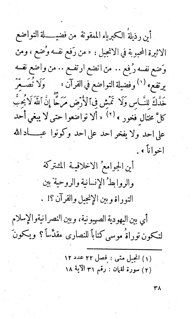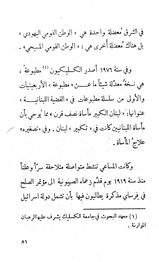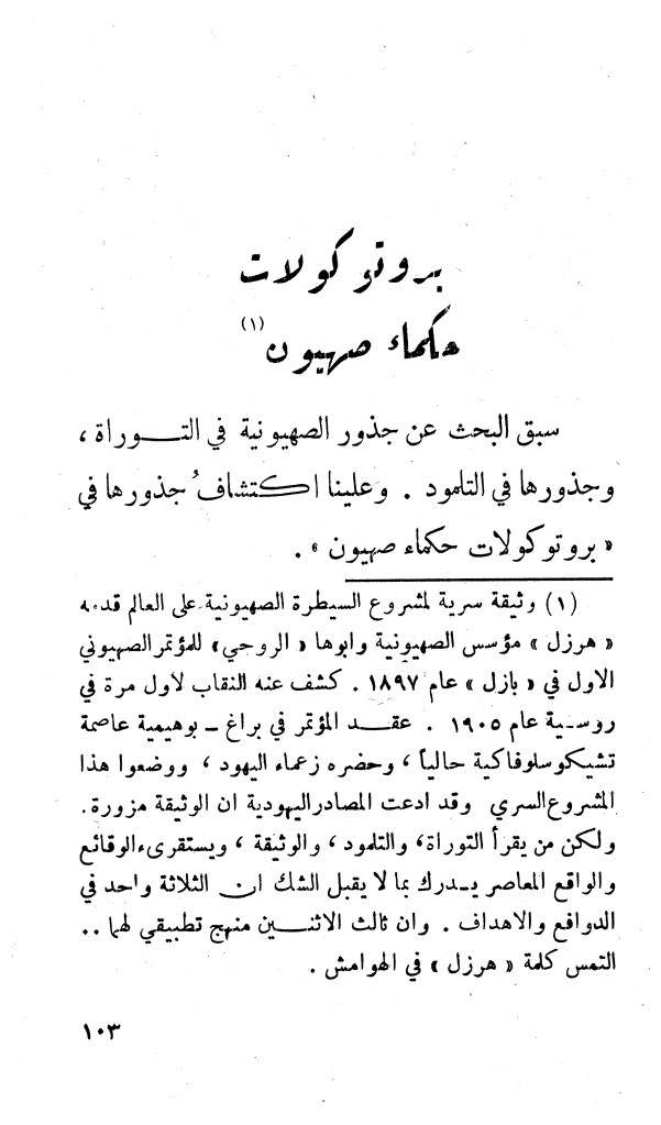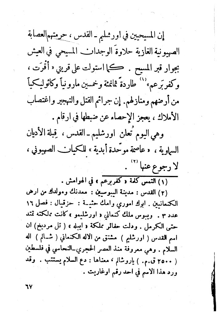| الأب طانيوس منعم خطر اليهودية الصهيونية على النصرانية والاسلام طبعة ثانية مصححة ومنقحة اقرأ وربك الاكرم الذي علم بالقلم علم الانسان ما لم يعلم العلق : ( ٣ – ٤ – ٥) مقدمة للحقيقة : انجيلاً وللحقيقة : قرآناً وللحقيقة : تاريخاً وللحقيقة : إعلاماً وإعلاناً كانت هذه الحروف صفحات في كتاب في الذاكرة معلومات هي في الذهن معارف وهذه وتلك في عمل يُمارس ، وواقع يُعايش حقائق تعقل فالتاريخ لا يكتب مرة واحدة (…) تمهيد نحن اليوم ، في لبنان والعالم العربي ، أمام تحديات خطيرة ، وفي فم منعطف تاريخي خطير. وما نعاني ، على أرض الوطن ، من صراع دموي ، وتمزق روحي وأخلاقي مرده الى جملة أسباب، من أعمقها جذوراً، جهلنا المزمن لحقيقة اليهودية، وبالتالي الصهيونية، مضافاً إلى جهل ذوي الحكم ، أو تجاهلهم ، منذ نشوء الكيان الصهيوني على تراب فلسطين العربية . فلقد واجهنا الصراع ، ولا نملك من فهم أسبابه ما يعيننا على مواجهته ، بامتلاك أدوات المواجهة ، لأننا لا نعي هذه الأسباب وعياً موضوعياً ، وتاريخياً ، كما لا نعي هذه الأدوات . جيلنا الذي يكابد الصراع أقسى مكابدة نشأ في منأيّ ثقافي عن فهم قضية فلسطين ، من حيث هي جوهر ما يعتمل في الشرق الأوسط من صراع .. ومن حيث إن الصهيونية نواة هذا الصراع. نشأنا ننظر الى واقع القضية نظر عين لامّة ، لا نظر عينٍ ناقدة . حرِّم علينا ذكر كلمة اسرائيل في كتاب ، أو صحيفة . كأنما ورودها هرطقة وطنية! وبخاصة في أعقاب حرب سنة ١٩٤٨ . هذه الحرب التي كانت ائتماراً بالعرب ، وباشتراك العرب .. أي باشتراك من يُسمّون قادةً : ملوكاً ورؤساء. لقد غرسوا رؤوسنا في رمال غير متحركة وغسلوا أدمغتنا من التفكير . ومنعوا الأقلام أن تجري بحرف باحث مستنير ومنير . أو بحرف يشير الى اسرائيل ، و خطر الكيان الصهيوني العنصري الحاقد على العرب ، مسيحيين ومسلمين. حتى لكأن تجاهل وجود الشر نفي لوجوده أو نشوئه ، أو تفاقمه ، أو سيطرته. كان جيلنا ، معلمون و مربون، ورجال دين وقادة وأحزاب في أُميّة ثقافية وسياسية ودينية لا يحسد عليها ، ولكن يرثى لها . فما كانت قضية فلسطين وقضية الصهيونية في اسرائيل ، تعني لديه شيئاً لا في تاريخها القديم، ولا في تاريخها الحديث . ولا في ما لها من مخاطر تتفاعل على مسرح الشرق الأوسط. ونحن فيها نحن ، معنيون لحّاً بهذا التفاعل ، في أسبابه ونتائجه . وتوثيقاً لما أقول أسوق هذا الدليل : خذ اليك برامج التعليم الرسمي في الأربعينيات حتى الستينيات، وما يترتب عليها من كتب ، فإنك لا تجد درساً واحداً في كتاب مدرسي يتناول قضية فلسطين ، والفلسطينيون مطرودون من أرضهم ، لاجئون في أرضنا . ومن أمس قريب كنت إذا ذاكرت أي أستاذ ثانوي ، أو طارحت جامعياً ، خطر الصهيونية على لبنان ، وعلاقتها بالقضية الفلسطينية ، وقعت على ما هو عجب عجاب ، فكراً وموقفاً ، هذا إذا لم يكتف بهز الكتفين وقلب الشفتين ، كأنما الأمر لا يعنيه ، ولا يثير اهتمامه من قرب أو بعد وهذه اللامبالاة انما هي نتاج فراغ ثقافي ، سياسي في هذا الباب ، غير مقصور على المثقفين وأكثرية الشعب، بل يتناول القادة والزعماء . فلقد كانت المنافع الآنية لهؤلاء حجاباً كثيفاً ما نعاً من استكشاف الغد، واستشفاف المستقبل. ولعل البحث البكر الذي تناول قضية فلسطين ، ولو على نحو مختل وأيديولوجية مريضة، كتاب « التنشئة الوطنية الانسانية » (1) ، ولكنه ظل كتاباً مطبوعاً بأناقة ، فلم يُعتمد ، ولم يُدرّس . واستبدل به كتاب آخر في « التربية المدنية » كان له حظ سلفه ، وألغيت مادة التربية من البرنامج الرسمي ، وظَلَّ النشء اللبناني ، في المراحل الثانوية ، بلا تربية مدنية وإنسانية ، ترك انتفاؤها من « ثقافة » الانسان في لبنان ممارسات لا إنسانية ورواسم وحشية ، في الحرب اللبنانية القذرة ، على مساحة هذا الوطن . وظل الوطن والمواطن بلا هوية ، لأن ذوي الأمر فينا ، وذوي السلطان ، مختلفون في شأن الهوية . . وجوهر خلافهم طائفي ، سياسي إيديولوجي . فما كان التوجيه التربوي هادفاً الى بناء وطن ومواطنين ينصهرون في و